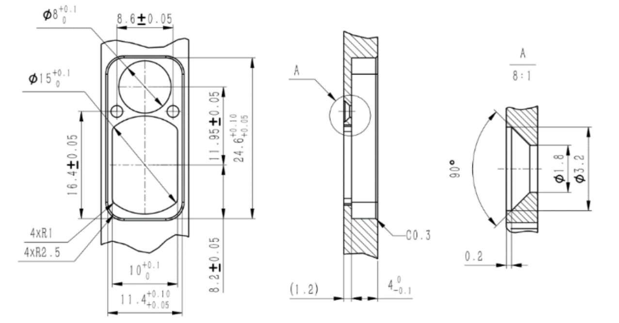 Den effektiva bländaren för det optiska fönstret beror på olika produkter. Dess yttre dimension bör säkerställa att det optiska fönstrets effektiva öppning - det optiska fönstrets ytterdiameter ≥ 2 mm och ytterdiametern på avståndsmätarantennen - den projicerade dimensionen för det optiska fönstrets effektiva öppning ≥ 1,5 mm. Det schematiska diagrammet visas enligt följande. Eftersom det optiska fönstret har en viss absorption av lasern, rekommenderas att tjockleken på själva det optiska fönstret kontrolleras inom 2 till 4 mm enligt den yttre dimensionen.